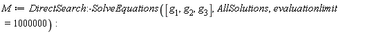 The SolveEquations command in DirectSearch seeks minima of , and returns an m × 4 matrix, each row of which details an extreme point: the value of R, a vector of residuals for each , the coordinates of the point, and the number of evaluations of R it took to find that point. The minima are arranged in order of increasing value of R.
