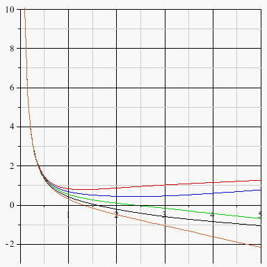 plot([g+y1,g+y2,g+y3,g+y4,g+y5],t=0..5,y=-3..10,color=[red,blue,green,black,gold]);