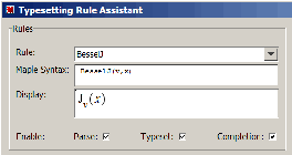 With the typesetting mode set to extended, changes made in the Typesetting Rules Assistant take effect. In particular, Figures 28.1 and 28.2 compare this Assistant before and after the parse rule for BesselJ has been changed. In Figure 28.1, the relevant portion of the Assistant shows the default settings for the Rules section. Figure 28.2, shows this section after the parse rule for BesselJ has been selected.