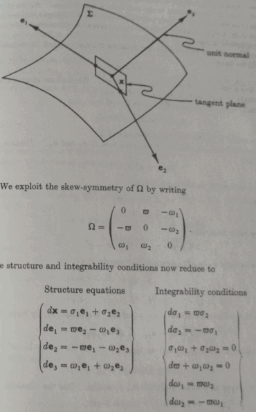 Consider a smooth surface Σ in = .  We choose a moving frame e at each point x of Σ in such a way that "e3 "is the normal to the surface.  Since x is constrained to move in the surface,