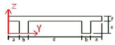 Der hier betrachtete Querschnitt hat die Form zweier nebeneinander stehender T's, wie im folgenden Bild dargestellt. Hier sind auch die globalen Y-Z-Koordinaten eingetragen.