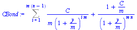 Let's define fixed-coupon bond as with coupon , yield-to-maturity , annual payment frequency and maturity years. The value of the bond can be expressed as a present value of future cash flows: