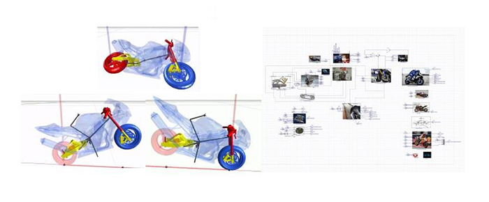 Dans le cadre de ce projet et afin de simuler les nombreux phénomènes physiques M. Nicolo devait absolument trouver un outil adéquat pour les modéliser précisément. Les différents domaines qu’englobe le développement d’un simulateur de pilotage font qu’il est nécessaire de disposer d’un outil performant, permettant une grande évolutivité et une rapidité de conception notable. M. Nicolo faisait auparavant appel à un modèle numérique codé à la main en C++. « Coder de A à Z un modèle de dynamique moto fut une très bonne expérience, mais elle a ses limites, notamment sur le degré de précision obtenu et sur l'évolutivité du modèle. J’ai été ensuite initié à MapleSim qui, comme je l’ai découvert, apporte beaucoup de sophistication à la modélisation physique requise pour ces expériences », confie M. Nicolo. « J’ai pu accéder à une version d’évaluation de MapleSim et cette période d’essai m’a convaincu que la solution MapleSim répondrait à mes nombreuses exigences du point de vue de la modélisation physique, des performances et de l’interopérabilité du code calculé généré. Le code généré à partir d’un modèle MapleSim est exempt de licence et bibliothèques propriétaires et l’utilisateur est ainsi à même de concevoir des modèles numériques pouvant s’adapter sans problème à de nombreux environnements temps réel ».
