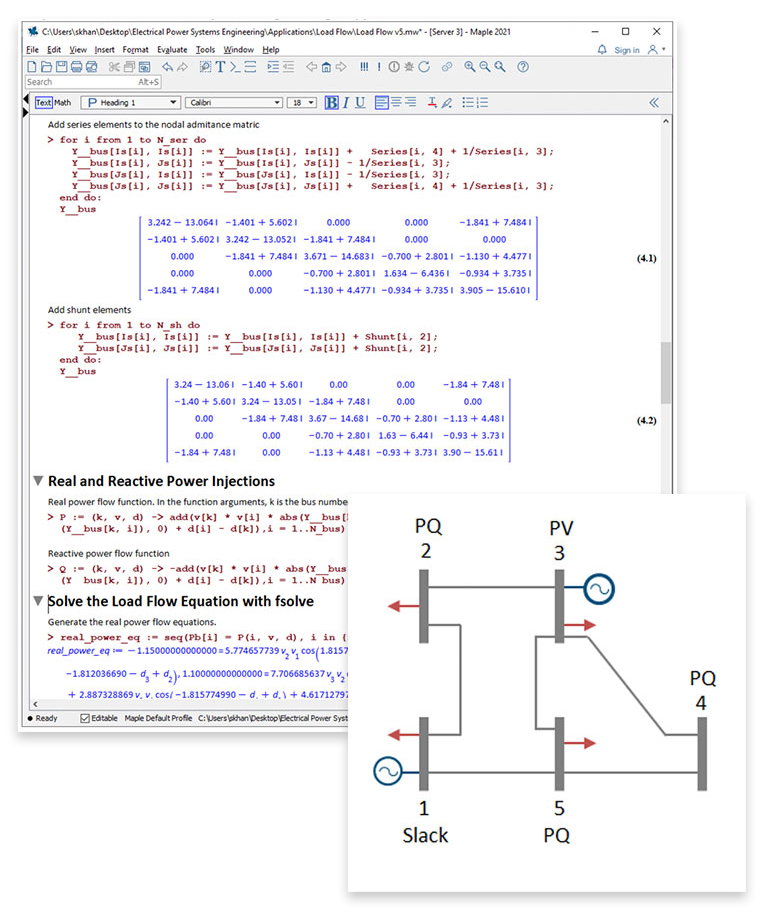 Cette application utilise Maple pour analyser un système électrique à cinq bus, et calculer les tensions et les puissances (réelles et réactives) à chaque bus.