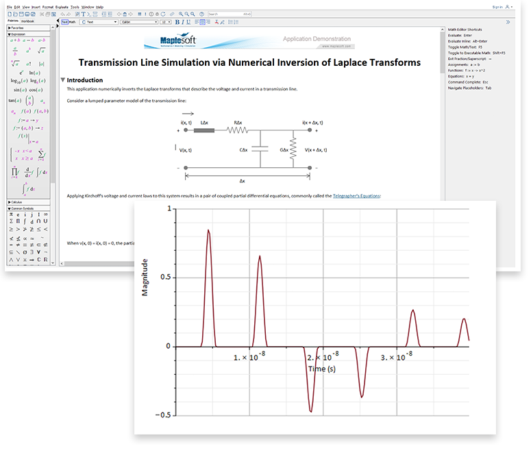 À l'aide de Maple, vous pouvez inverser numériquement les transformées de Laplace qui décrivent la tension et le courant dans une ligne de transmission. Cela nécessite des algorithmes numériques rapides et efficaces, connectés de manière fluide à un ensemble plus large d'outils de tracés et de documentation.