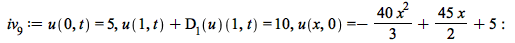 Example 9: This problem represents the temperature distribution in a thin rod whose left end is held at a fixed temperature of 5 and whose right end loses heat by convection into a medium whose temperature is 10. There is also an internal heat source term in the PDE (Articolo example 8.4.3):