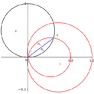 use plots in module() local p1,p2,p3,p4,r1,r2; r1:=sin(t); r2:=1/5+cos(t); p1:=implicitplot([r=r1,r=r2],r=-2..2,t=-Pi..Pi,coords=polar,gridrefine=3,scaling=constrained,color=[black,red]): p2:=plot([[0,0],[12/25,9/25]],style=line, color=blue): p3:=textplot({[.55,.4,typeset(P)],[.21,.24,typeset(R[1])],[.27,.14,typeset(R[2])]}): p4:=plot([[12/25,9/25]],style=point,symbol=solidcircle,symbolsize=15,color=green): print(display(p1,p2,p3,p4,scaling=constrained,labels=[x,y],tickmarks=[[0,.8,1.2],[-.6,0,1]])); end module: end use: