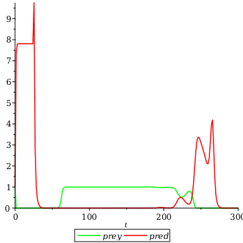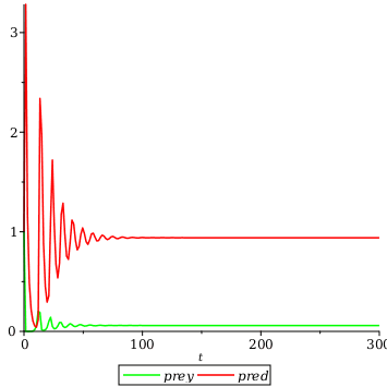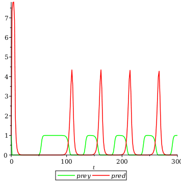 plots[odeplot](dsn, [[t, prey(t), color = green], [t, pred(t), color = red]], 0 .. 300, legend = [ prey, pred ], labels = [t,""] );