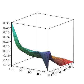 The ImpliedVolatilitySurface command creates new implied volatility term structure with the given parameters. This term structure is represented as a module. This module can be passed to other commands of the Finance package that expect an implied volatility term structure as one of the parameters; it can also be used as if it were a procedure. Assume, for example, that the module returned by ImpliedVolatilitySurface was assigned to the name V. Then for any positive constants T and S, VT,S will return the corresponding value of the implied volatility. If one of the parameters T or S is non-numeric, VT,S will return unevaluated.