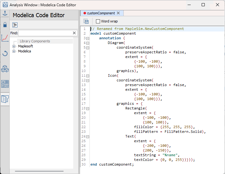 The right panel contains a code editor that lets you define a Modelica custom component using the Modelica programming language. It contains features such as automatic syntax highlighting, indenting, word wrapping, syntax templates, and autocompletion. To copy the Modelica custom component to your model, click Save Modelica custom component ( ). You will then find the Modelica custom component under the Local Components tab ( ) of the MapleSim window.