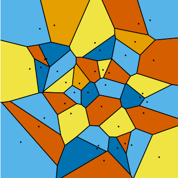 If the colorregions option is set to false, the Voronoi regions are represented by their outlines. Otherwise, they are represented by filled polygons such that no two adjacent Voronoi regions have the same color; the colors used depend on the value of the option: