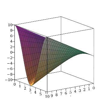 plot3dxcosy,x=0..10,y=0..2π,tickmarks=10,10,10,axes=boxed