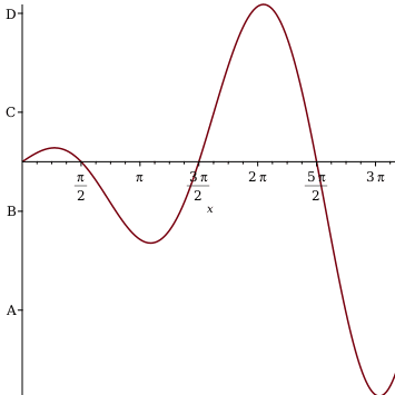 plotxcosx,x=0..10,tickmarks=piticks,6=A,2=B,2=C,6=D