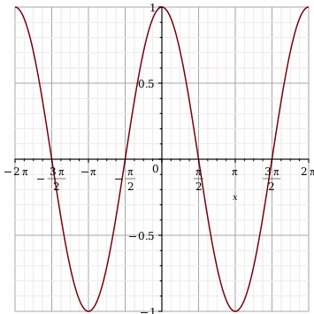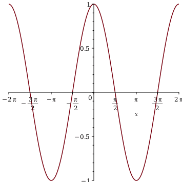 plotcosx,x=2π..2π,tickmarks=spacingπ2,default