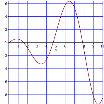 plotxcosx,x=0..10,axis=gridlines=10,color=blue