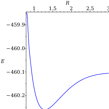 atomAconvertelementA,string:atomBconvertelementB,string:Rdataseqi,i=Rmin..Rmax,0.05:   # Determines the points at which our PES will be explicitly calculated molecules  seqatomA,0,0,0,atomB,0,0,i, i=Rmin..Rmax,0.05: R  evalnR:edata mapEnergy,molecules, method=ESmethod,basis=AObasis:pes  splineRdata,edata, R,2: plot_pes plot pes, R=Rmin..Rmax, font=ROMAN,16, labelfont=ROMAN,16, labels='R','E', color=blue