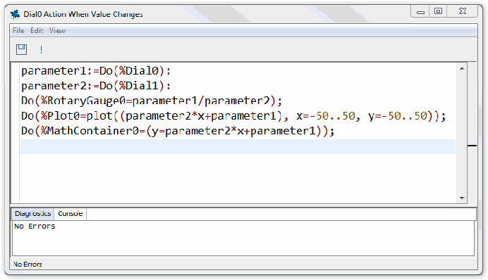 These graphical components help you to create documents to use and share with colleagues or students, that interact with Maple code within the document without needing the reader to understand that Maple code. Other methods of interaction with Maple are described throughout this guide.