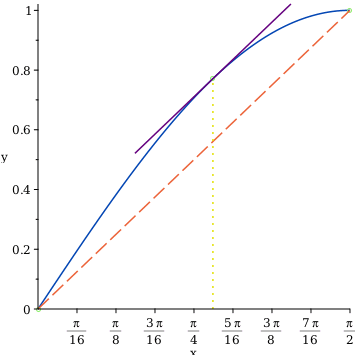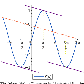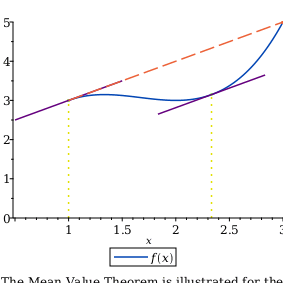 The routine MeanValueTheorem takes an expression representing the function, checks that the requirements of the theorem hold, and then plots the expression and all points where the derivative equals the slope of the secant line connecting the end points of the graph of f on a,b.