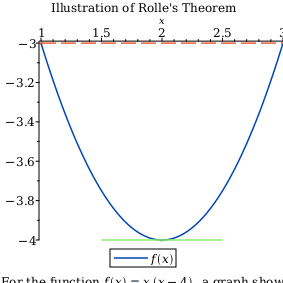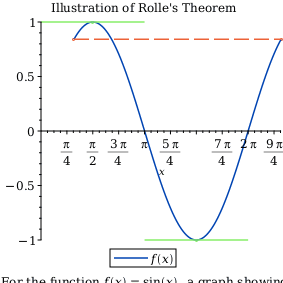 The routine RollesTheorem takes an expression representing the function, checks that the requirements of the theorem hold, and then plots the expression and all points where the derivative is zero.
