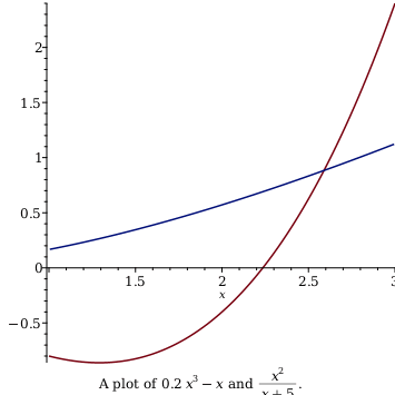 plot0.2x3x,x2x+5,x=1..3,caption=typesetA plot of %1 and %2.,0.2x3x,x2x+5