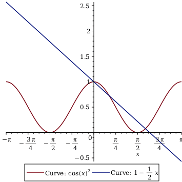 plotcosx2,112x,x=π..π,legend=typesetCurve: ,cosx2,typesetCurve: ,112x