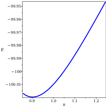 plotpesR, R=bonds1..bonds1, axes=boxed, labels='R','E', color=blue, thickness=3;