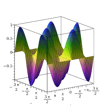 plot3dsinxcosy,x=32π..32π,y=32π..32π,colorscheme=Colorwheel