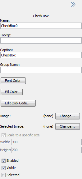 To perform an action when a check box is selected, click the check box to display the Check Box context panel. Select Edit Click Code to open the Code Editor dialog for the check box. Enter the commands you want to perform in the Code Editor dialog.
