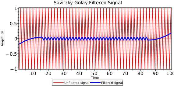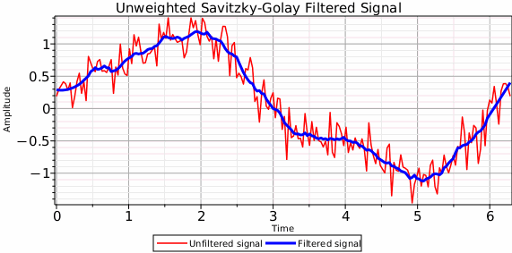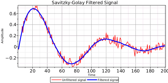 The SavitzkyGolayFilter command applies the Savitzky-Golay Filter to a 1-D signal with real-valued data, which is useful for smoothing noisy data and estimating derivatives. The method is also known as the Least-Squares Smoothing, Polynomial Smoothing Filter, and Locally Weighted Scatterplot Smoothing (LOWESS).