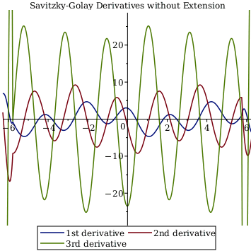 dataplot⁡T,Y1,style=line,legend=seq⁡sprintf⁡%s derivative,convert⁡i,english,ordinal,i=1..d,title=Savitzky-Golay Derivatives without Extension,view=DEFAULT,min⁡Z..max⁡Z