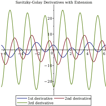 dataplot⁡T,Y2,style=line,legend=seq⁡sprintf⁡%s derivative,convert⁡i,english,ordinal,i=1..d,title=Savitzky-Golay Derivatives with Extension,view=DEFAULT,min⁡Z..max⁡Z